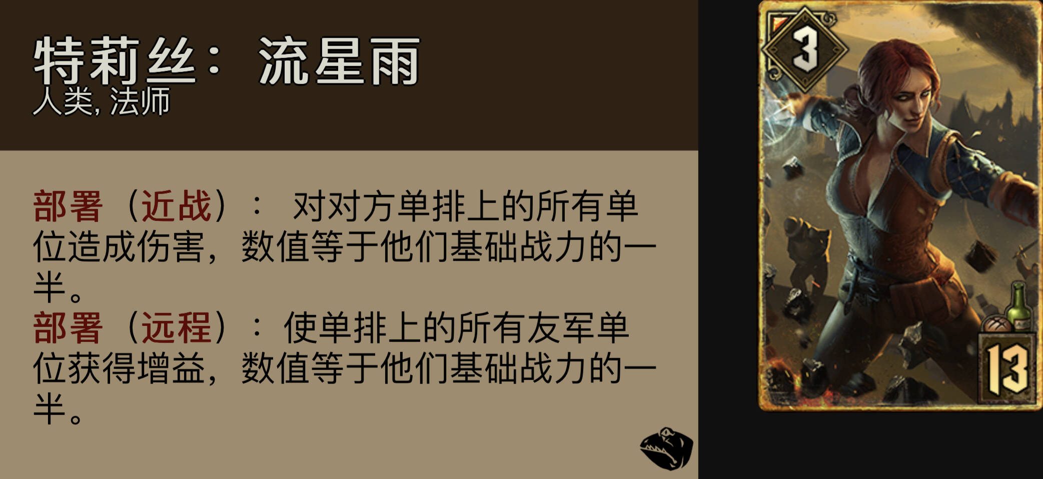 特莉丝-流星雨:卡组扎实的点数来源与长局的保障。但是这张卡短局很小,所以如果r1开了过后能保障拿下胜利,则可以考虑r1开掉。多数情况是r2逼牌开掉or r3作为终结技使用。特别注意该卡在血剑的范围内,所以对抗同化时一定需要谨慎使用。