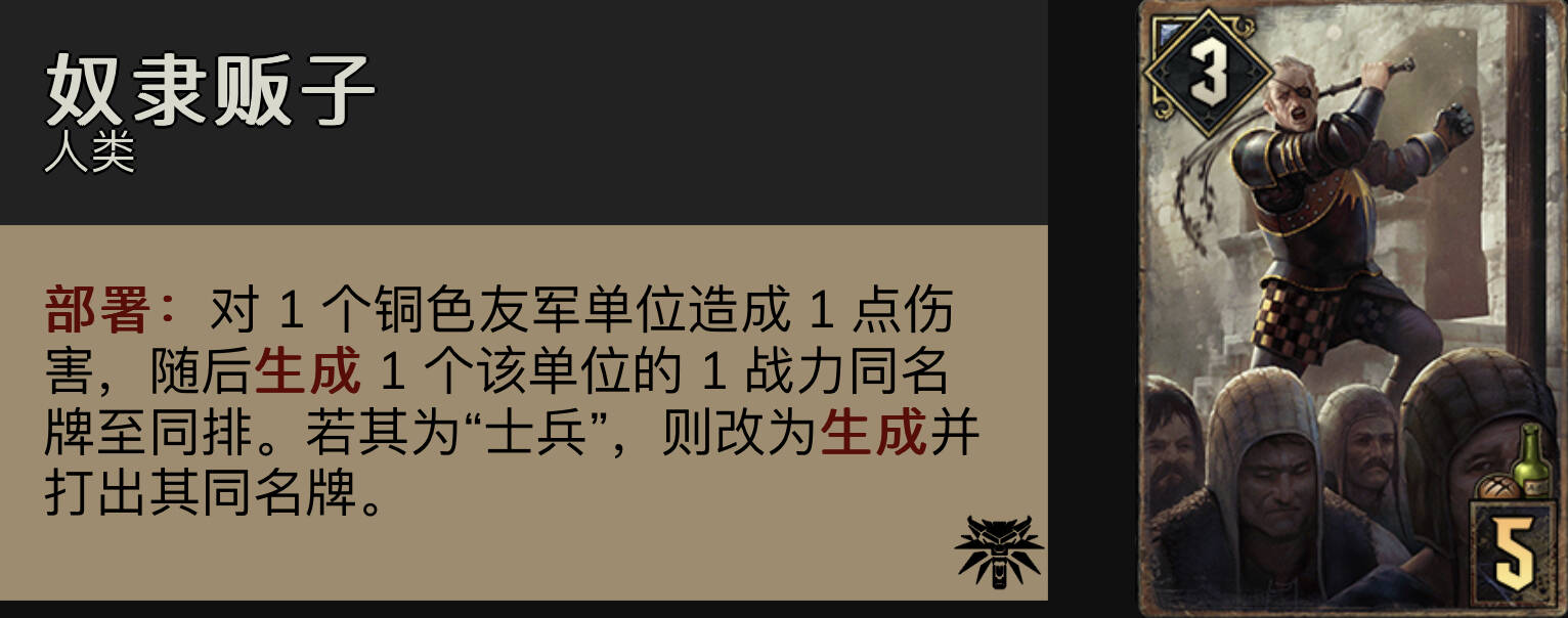 奴隶贩子:非常灵活的铜卡,r1配合其他士兵可以提供扎实的控制和点数。同时短局配合中士也是点数保障。现在的主流卡组r1控制能力普遍不强,所以奴隶贩子+轻骑兵是拿下r1的最划算的方式。