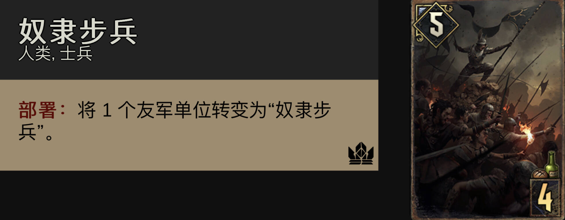 奴隶步兵:扎实的点数牌,同时可以提升流星雨的点数。在对抗群岛和抓6时,需要留一张来分别处理索佛召唤的野兽(万一对面贪呢,即使不贪也可以稳定变掉女海妖),以及假希里。对抗和谐则可以变掉被毒的单位(和谐一般只有三张毒,很容易直接就防住了)。