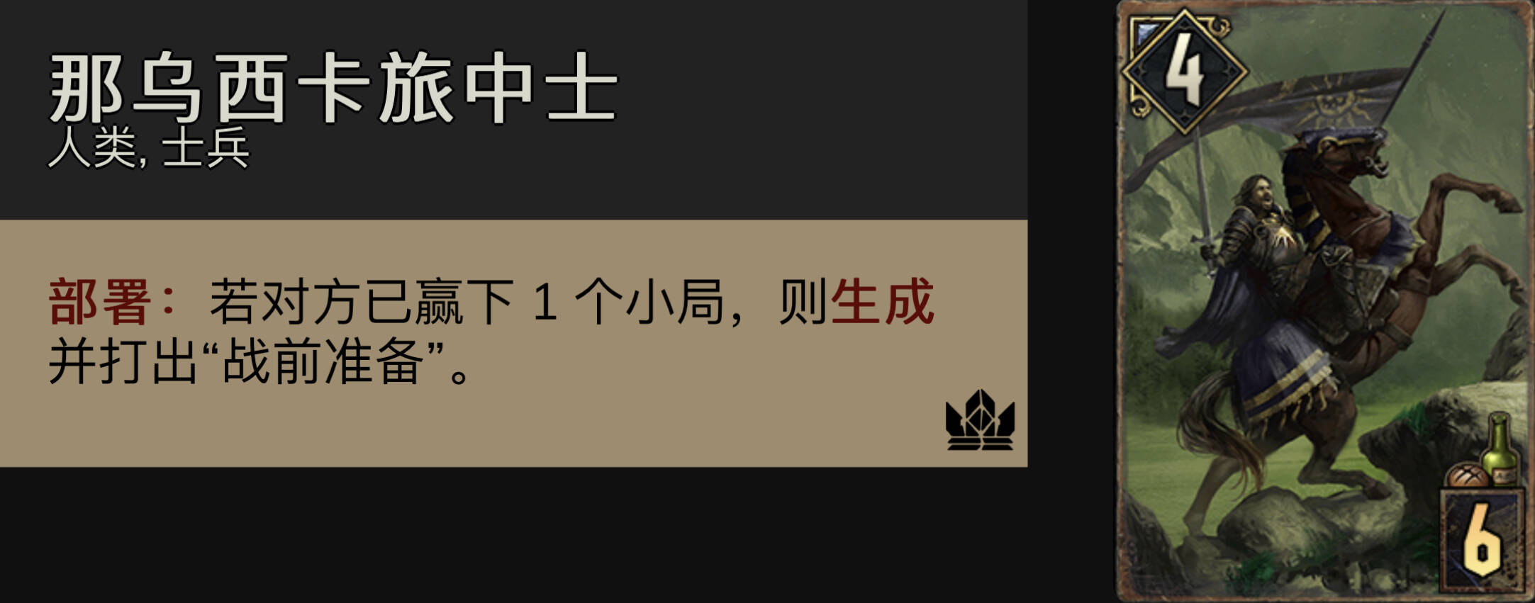 伦芙芮的手下:俗称对6,唯一的滤牌,同时提供扎实的点数+为流星雨铺垫。注意对战群岛时尽量晚打对6,两个大白字会让群岛很舒服。虽然对6是滤牌,但是情况允许的话r1不要随便把对6交出去(因为r1仅靠轻骑兵+侦察员已经有不俗的点数),留下对6用来逼牌会更好。