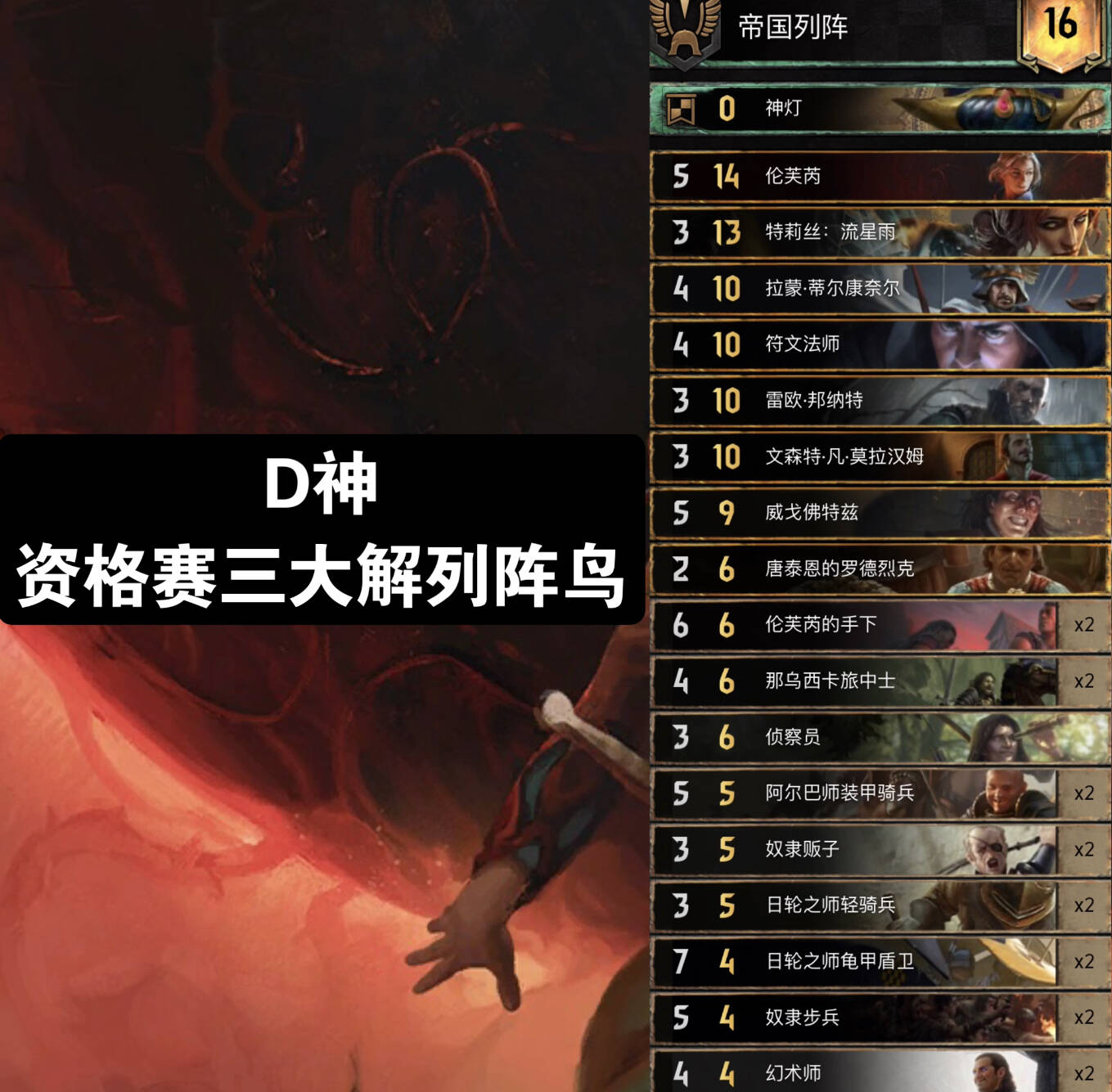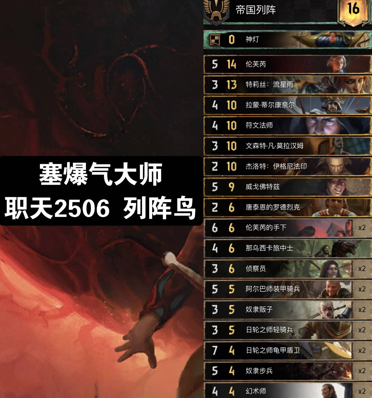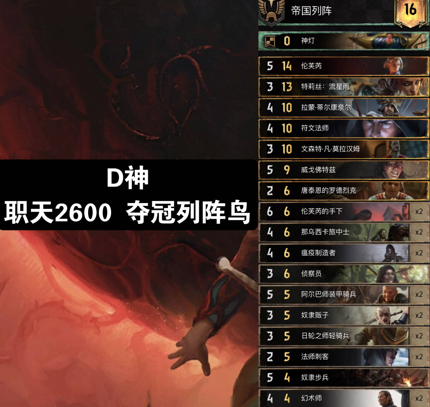 士兵鸟帝,前朝的霸主经过打磨重整仍然在环境中占有一席之地!在众多高手手中仍然有着不俗的发挥。与前朝双锁领袖+纯点数的思路不同,帝国阵列的领袖能力配合日轮之师轻骑兵,能在r1提供凶狠的压制力。厌倦了抓6帝国的你不妨尝试一下这套卡组。