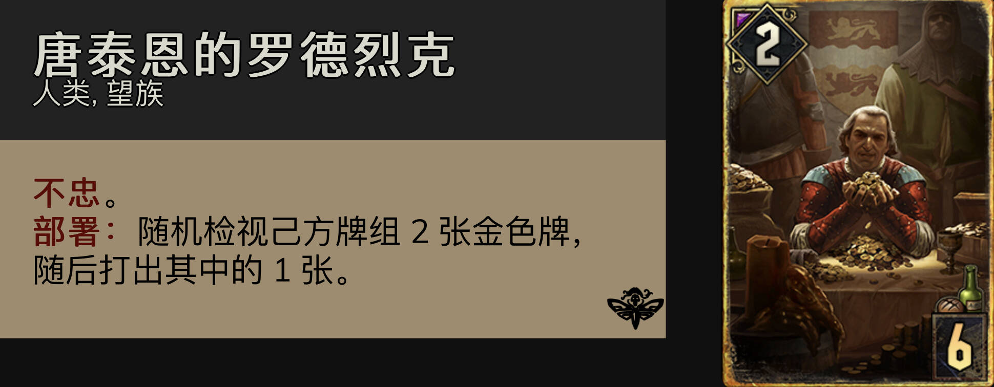 罗德列克:唯一的检索,非常珍贵的金卡。在没摸到鸟的时候一定不能随便r1开掉。另外如果侦察兵已经看过自己牌顶后,罗德列克可以优先打已经确定沉底的大金。