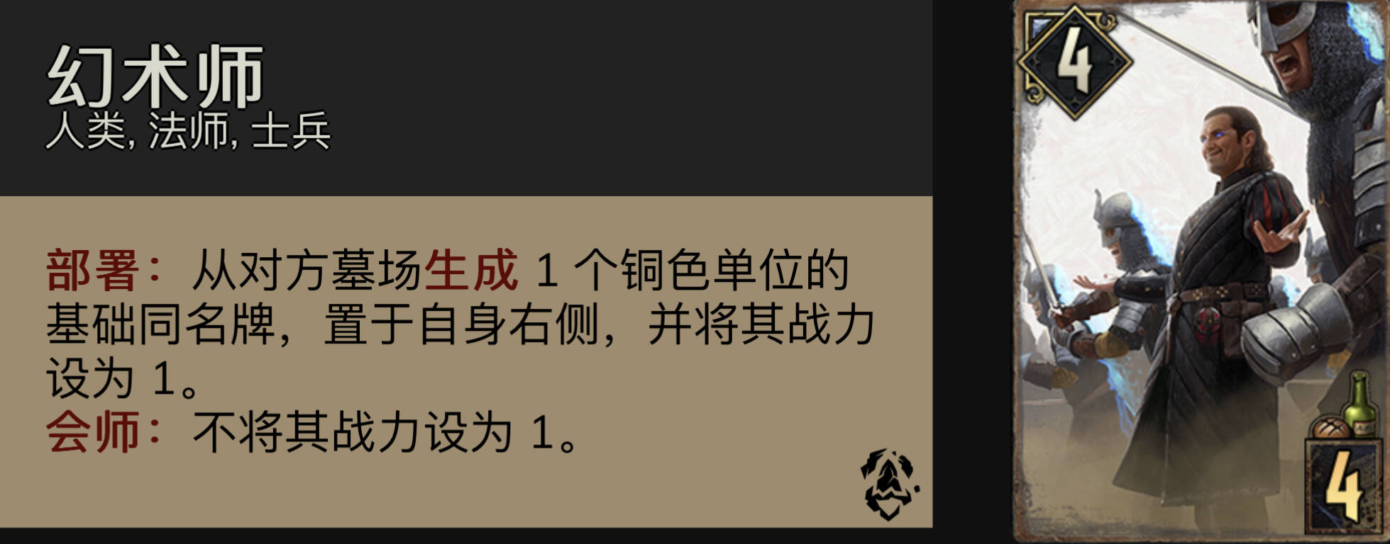 幻术师:多数情况r1可以直接换走,但是在对面墓地会留下铜卡引擎的时候,可以在r1保留这张卡。不管是逼牌还是抗逼时,用幻术师直接出对面的引擎可太舒服了。这些引擎包括且不限于和谐的跳跳组件,北方的游侠骑士与斥候。特别是对战猎龙北时,一定要留下幻术师这张卡。