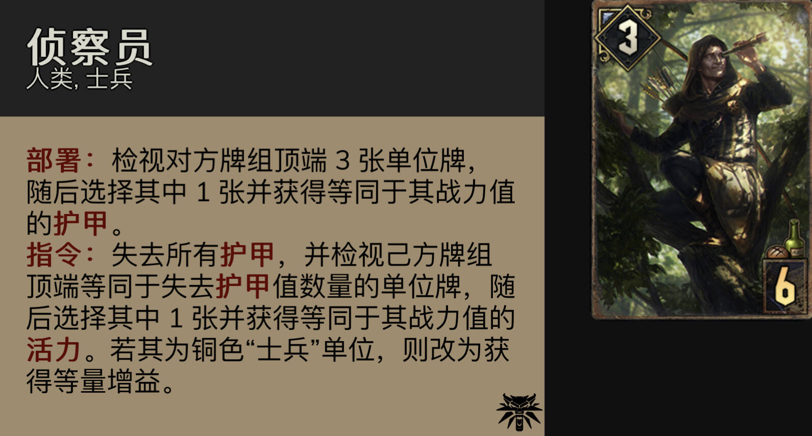 侦察兵:经过数次削弱,侦察兵已经不再无脑超模,但仍然是卡组r1r2重要的点数支撑,还能提供重要的战略信息(对面牌顶是否有威爷的目标,以及我方牌顶能摸到哪些卡)。注意打抓6要用一下领袖让侦察兵脱离大赦的范围。