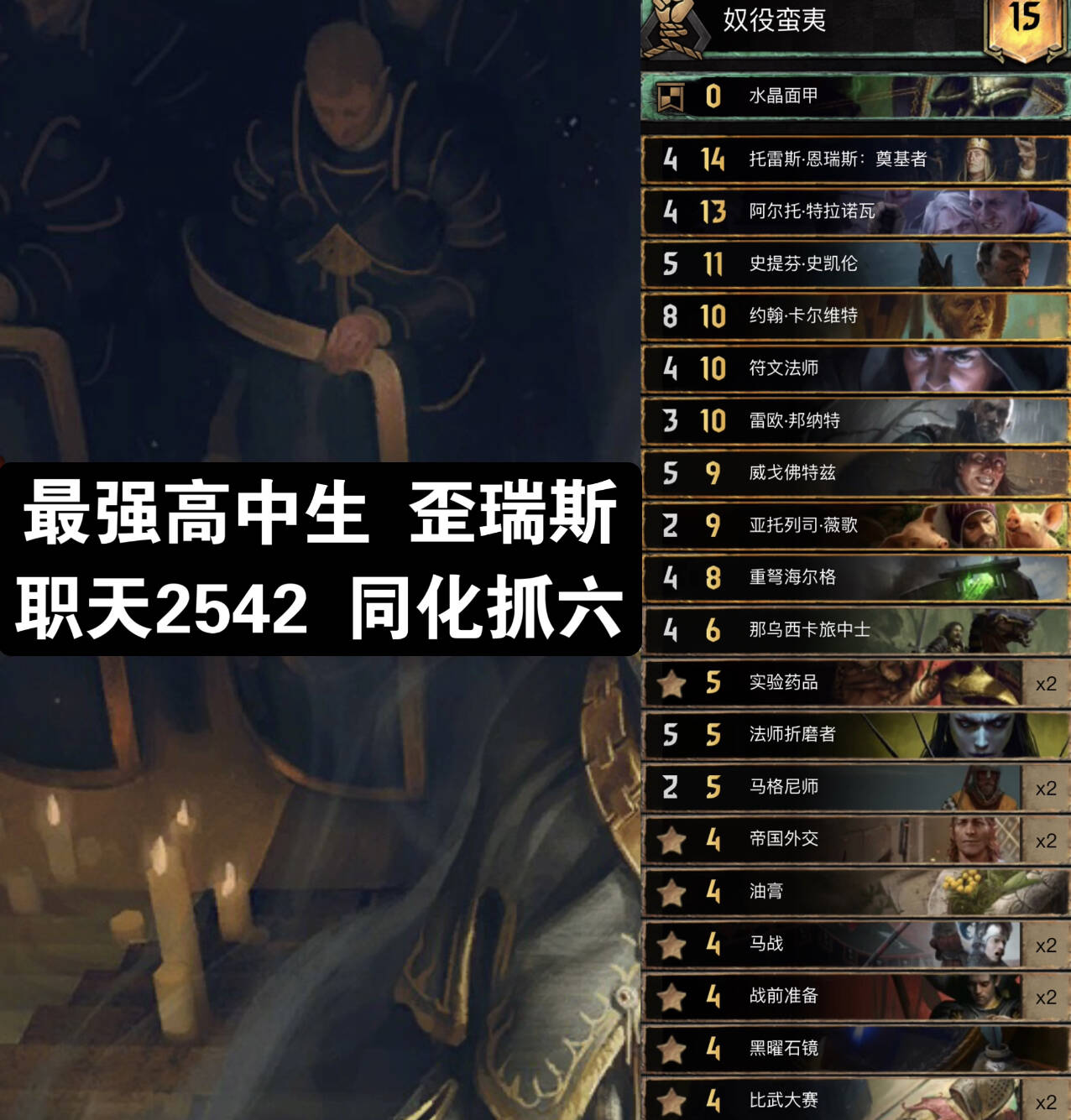 铜卡单位:若超过三张,会使在符文法师前打出的薇哥不稳定。折磨者和马格尼师必带,推荐带中士,能保障r3点数。其余选项为奴隶贩子和4p弩。