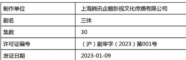 今日(1月9日)报道,有消息称,由张鲁一、于和伟、陈瑾、王子文、林永健、李小冉等主演的国产《三体》电视剧获得发行许可证,编号为(沪)剧审字(2023)第001号,制作单位为上海腾讯企鹅影视文化传播有限公司。爆料称,该剧暂定1月16日左右在腾讯视频上线,共30集。