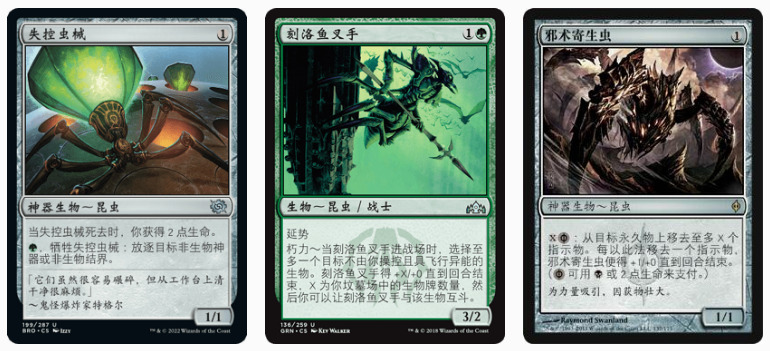 失控虫械和邪术寄生虫都是能被克撒传找出来的生物,前者能够去除对方的克撒传,放在场上就能防对手的冥界裂隙,寄生虫则能和自己后面的克撒传配合,通过不停的挪指示物让克撒传一直处在能造机枪兵的章节,达成一个伪组合技。