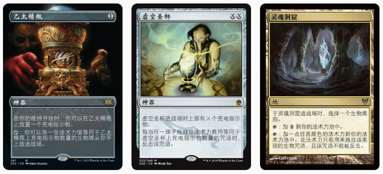 这套牌自己满编了乙太精瓶与灵魂洞窟,因此也能比较舒服的主牌使用满4的虚空圣杯而不太多的影响自己,能二回合挺出1豆圣杯,在和龙侯、巨锤的对局都几乎能奠定胜局。