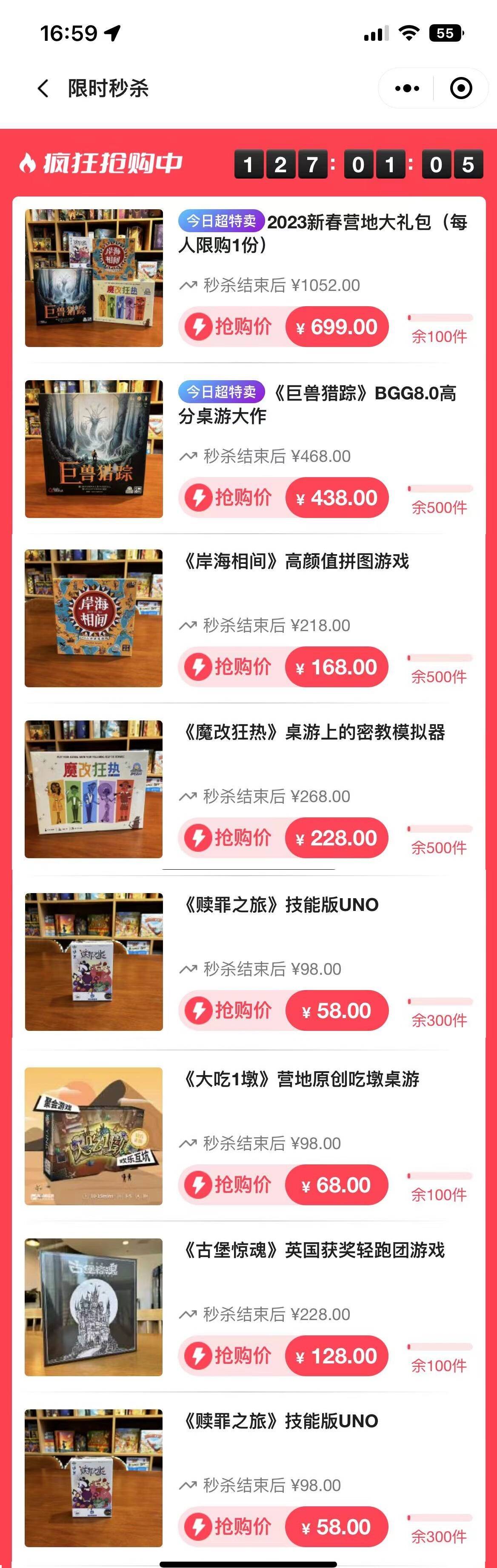 以上四款游戏是今年营地新代理的游戏,在本次营地商城新春特卖中,24小时内包邮发货(顺丰/京东/德邦),当然之前代理的游戏,我们也会进行特卖,欢迎大家关注。希望大家能在节日期间与家人朋友一起享受桌游的快乐。