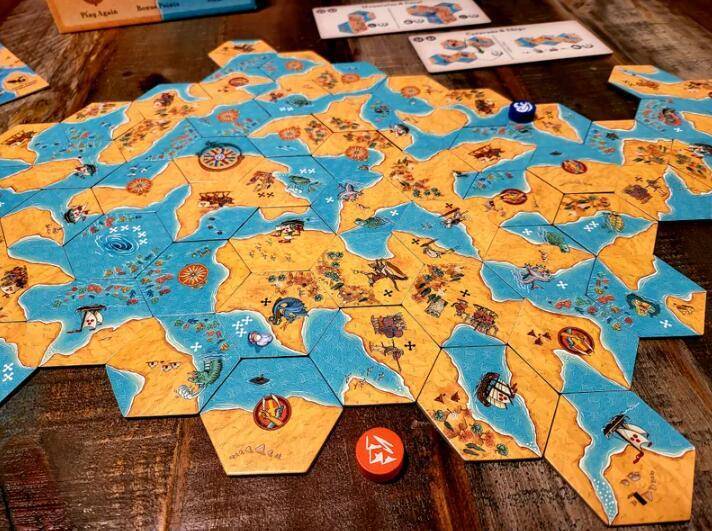 今年静电森林联合营地还代理了2款游戏的桌面游戏,非常适合在悠闲的假日进行娱乐。很多玩家注意到《岸海相间》这款游戏源自于它的超高颜值,而实际上它是一款极其有趣的对抗博弈类拼图游戏。有人说《卡卡颂》后鲜有拼图游戏,但岸海就是这么一款给人新感觉且规则极其简单的游戏:玩家好比是为上帝规划地表形貌的制图师,扮演大陆或者海洋中的一方,和另一方通过拼凑特定类型的地貌来获取更多分数。2人对抗,3人乱斗,4人分阵营,特别适合大人小孩一起游戏。