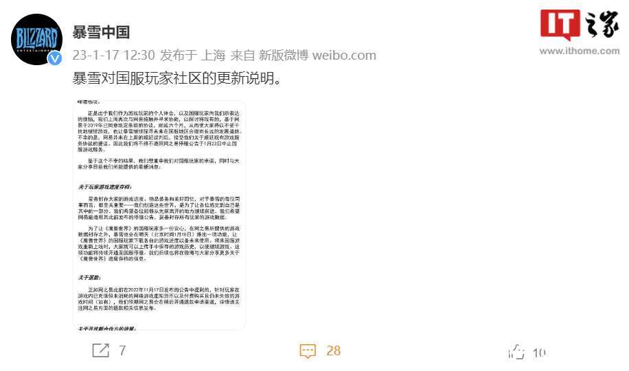 IT之家 1 月 17 日消息,暴雪中国今日中午发布说明,对暴雪娱乐在国服地区的游戏服务状况作出说明。