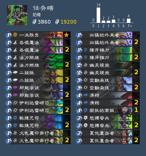来自奶青的任务瞎,他用这套牌在本月初以27-10的战绩在国服登上传说。奶青说这套牌打快攻卡组优势明显,基本上你能排到的快攻卡组都有优势。由于没带直伤(武器),在对抗控制卡组时需要合理运营法力燃烧及滑翔。卡组打开门法和鬼灵贼的数据不多,但奶青说也是优势。新卡复仇重击者是恶魔,在任务瞎中的减费速度也很可观并且能够被邪能学说复制。奶青提及的一个点是凶猛的外来者必须要在流放位才能下一张流放牌-1费。卡组完全注重于展开,更丝滑,但也更需要注意细节。