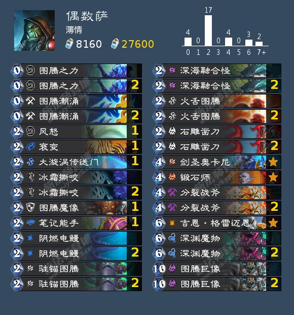 对战偶数萨,三大快攻中对战偶数萨的胜率稍微低了一点,在与偶数萨的对战中,2费的节奏点尤为重要,因此起手尽力找2费三鱼人,其中螃蟹骑士可以单吃一切1费图腾是最强的,剑圣萨穆罗能否准时出场也是关键点,488跳费后龙巢之母和海兽号是解决图腾巨人的关键。