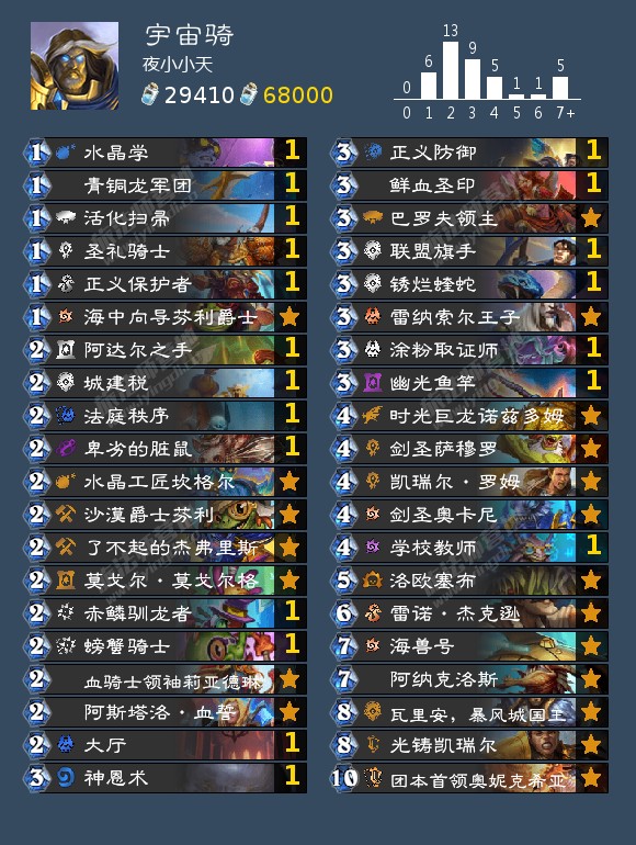 对战一众中后期卡组,虽然现在环境稀缺,但仍分享一下对局思路,由于是特化的中速宇宙骑,后期难免乏力,我们的最强一波就是488接法庭秩序不断拍大怪压死对面,前期的涂粉取证师和剑圣奥卡尼是重要的压制点,螃蟹骑士在吃到buff的情况下可以打出相当客观的伤害,幽光鱼竿可以在中期补充资源的同时扩大场面优势。