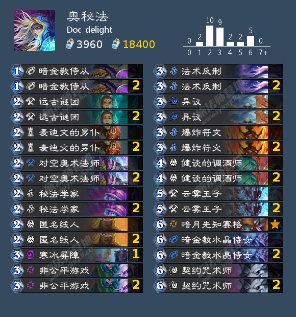 昨天看到日报评论区有读者朋友想要奥秘法,刚好今天就有。Docdelight用这套牌打到美服第28。可以动的卡位开在寒冰屏障上,富哥们可以换成豪宅管家俄里翁,穷哥们可以换成火焰结界。豪宅管家俄里翁是一张卡手牌,但也是一张可以让你直接赢的牌,非常之极端。