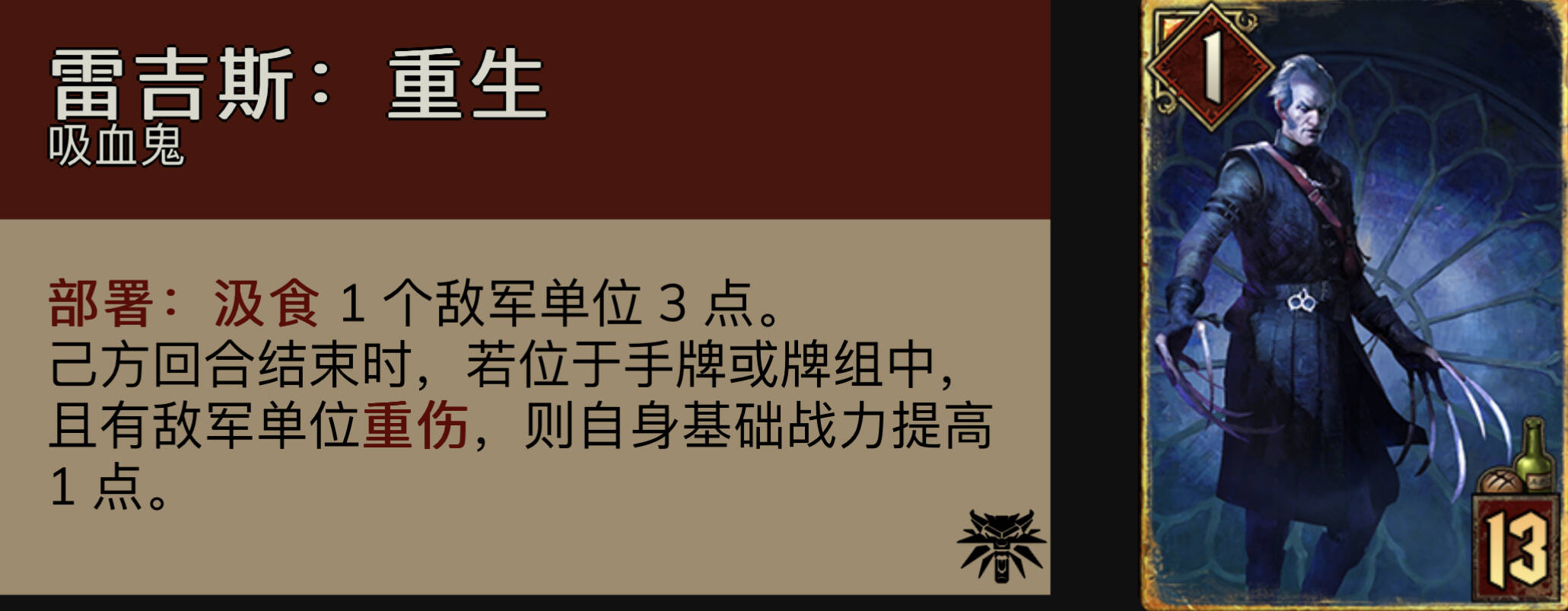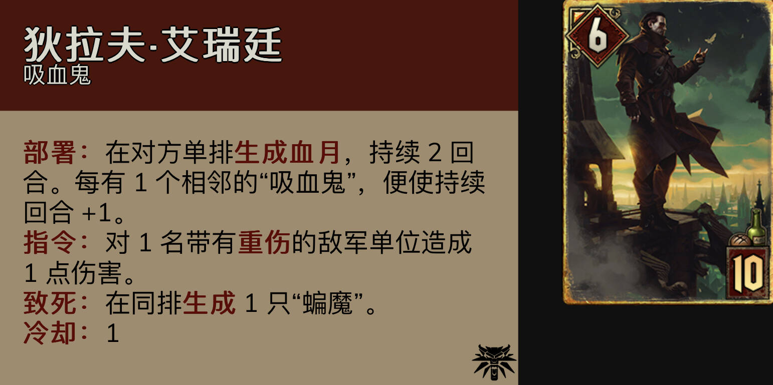 狄拉夫的血月收益很多时候都会游戏中的rng所规避,比如流血被遮蔽吃了,打2造成伤害溢出都是很常见的;打1还有出3的引擎效果还算可以,但往往站不住。所以我觉得这张卡比较尴尬,不过毕竟是落地就有一定收益的较为扎实的卡,对方也不一定管的过来所有的引擎,血月的全自动流血再pass后仍然可以给蝠翼魔创造收益,同时在算点上会给对方带来难度(对方需要计算血月收益最高的情况才敢pass,如果点数没有算明白甚至可能让吸血鸟多赚一张卡),所以我目前选择携带这张卡。