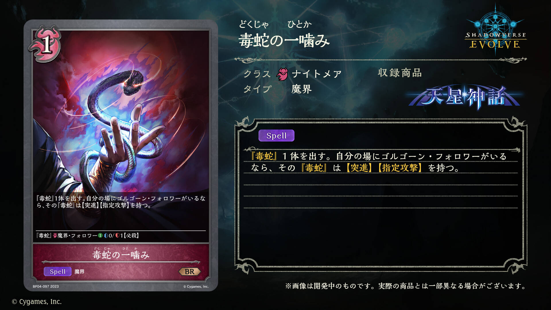 Quick 启动 横置这张牌,将自己场上的2个“毒蛇”置入墓场:选择1个对方的随从,破坏那个随从。