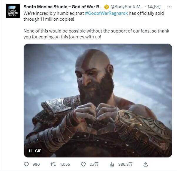 《战神:诸神黄昏》累计销量突破 1100 万,圣莫尼卡工作室放出奎托斯比心贺图
