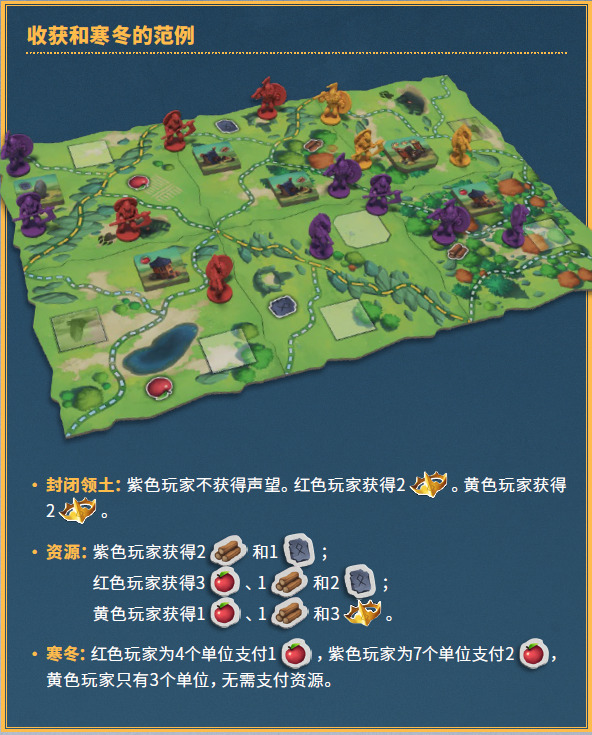 收获阶段也是顾名思义就是从自己占领的地盘上收东西,这里可以收获的东西分两类,一种是从所有自己占据的领土和建筑上收获对应标记的物品,包括食物、木材和知识。另一种是获得声望分数,只有封闭领土才能带来分数(大小不同分数有区别),另外就是特殊建筑“国王祭坛”可以收获分数。