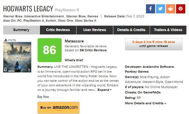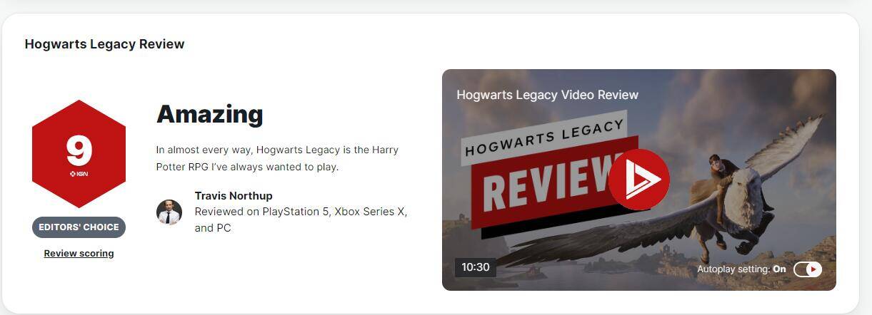 《霍格沃茨之遗》媒体评分解禁,截止本文发布,IGN给出的评分为9分,M站评分为86。
