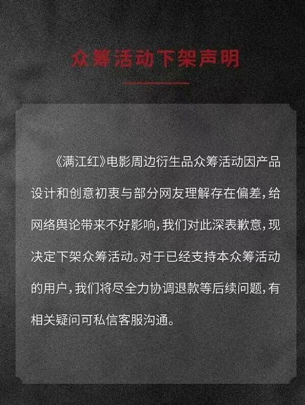 “电影周边衍生品众筹活动因产品设计和创意初衷与部分网友理解存在偏差,给网络舆论带来不好影响,我们对此深表歉意,现在决定下架众筹活动,对于已经支持本众筹活动的用户,我们会尽全力协调退款等后续问题,有相关疑问可私信客服沟通”