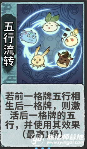 五行流转,就是上面那流转公式,随便两系牌中间插入这张牌,比如土金之间,土—五行流转—金,嗯,这张牌会生效,及每轮运行到这张牌的时候都会,激活金印记,并转变成那张金牌(就是复制金的效果并使用,注意这里是五行流转这张牌复制后面一张金的效果并使用,那张金牌还没使用,后续配合混元无极阵,就是一回合使用两次那张金牌)但是一级的流转只能使用那张金一级的效果。——表达能力可能不太好,大家试试就知道啦。