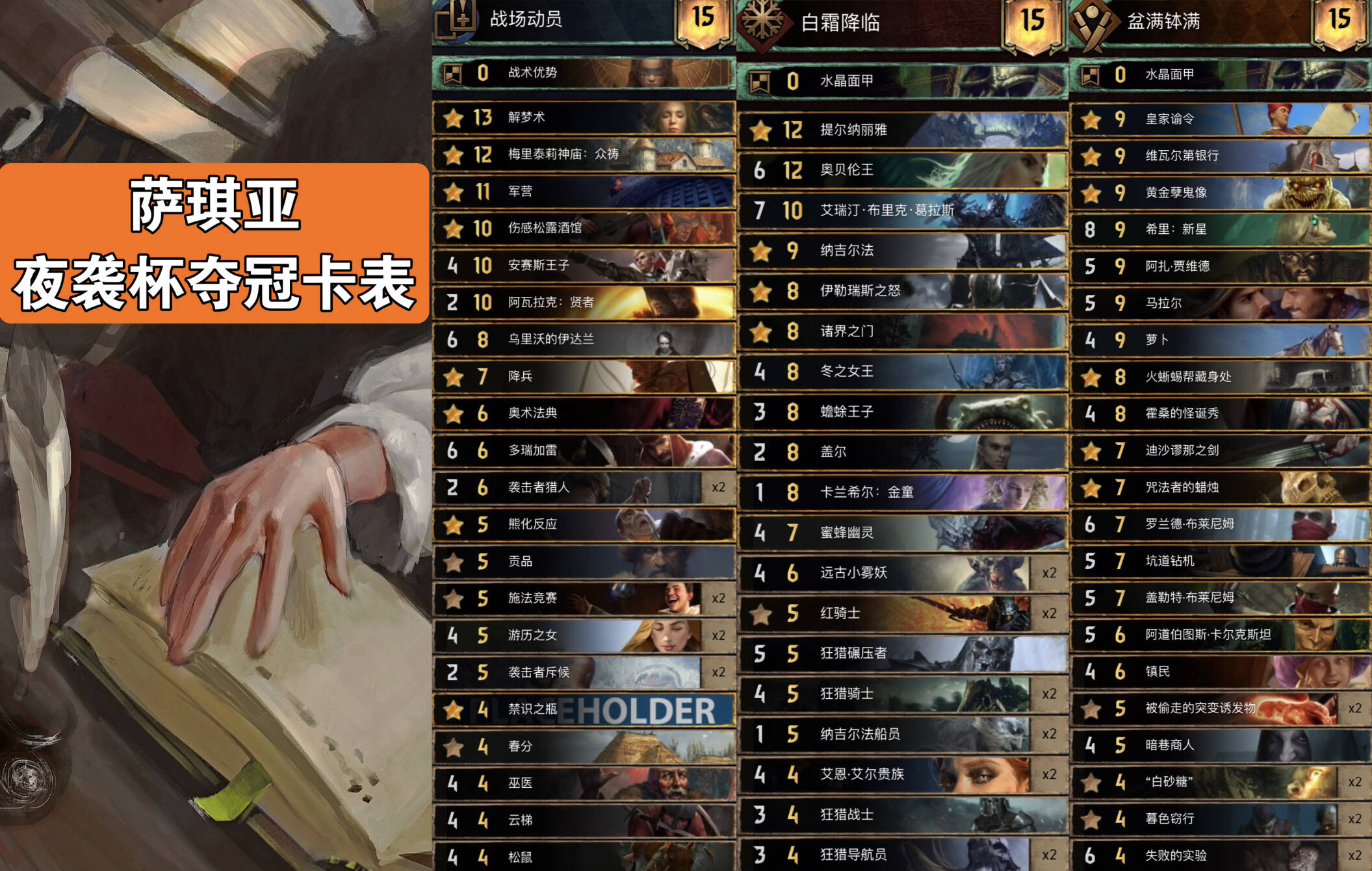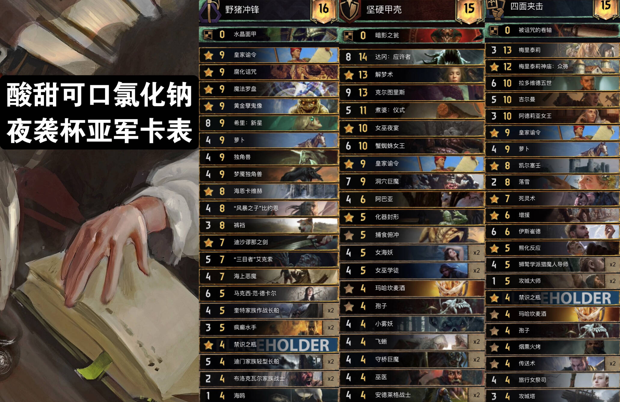 获奖心得:暗牌表的比赛可以更好地通过对方选用的卡组进行针对,第一次交手所用的卡组如果没有拿下,那么很有可能拿出两套卡组counter进行三关,所以这一套卡组必须要有足够的绝对强度,难以针对。 第一次在社区赛中夺冠,感觉还是挺好的。虽然打的过程中还是有些伏笔,对于一些卡组用着也不够熟练,但是为了夜幕、影袭的称号,总体来说打的还是很功利的。希望CN选手能在接下来的64强预选赛中取得好成绩。