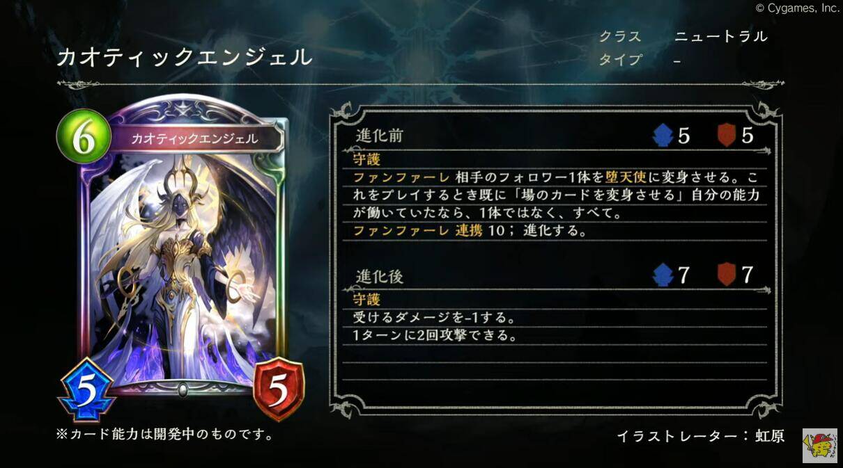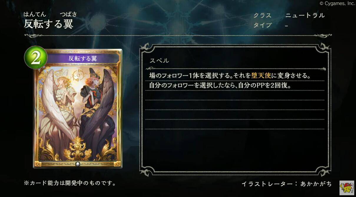 入场曲 使1个对方的随从变身为堕天使。使用这张牌时,如果本局对战中自己已发动过了“使战场上的卡牌变身”的能力,则改为令所有对方的随从变身。