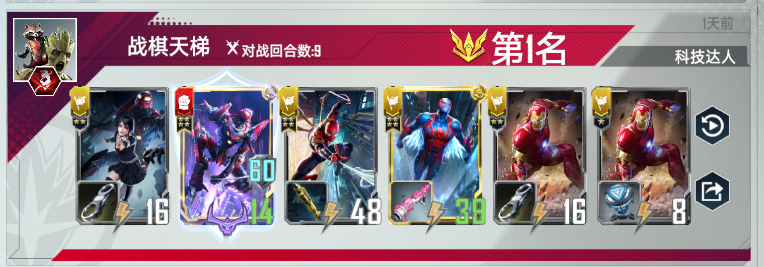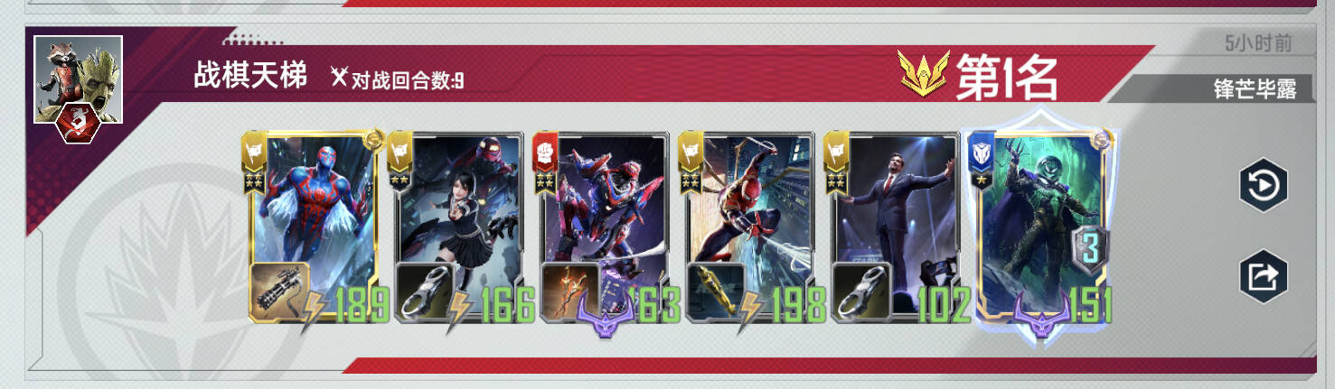 六七回合:阵容基本成型潘妮除了手铐其他武器一律不给,这时我们的阵容是潘妮,蜘蛛机甲,荷兰弟,2099,托尼,毒液秘境魔,可以找托尼四星夜巡回去下下回合打出。