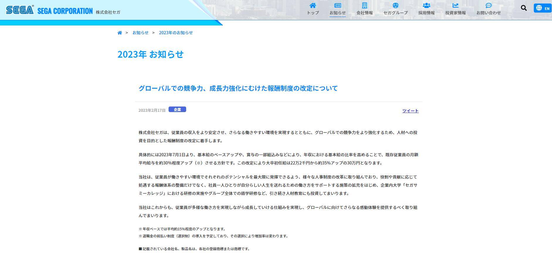 今日,日本游戏公司世嘉株式会社发布公告,为了使员工收入更加稳定,提供更加舒适的工作环境,进一步增强在全球的竞争力,修改以投资人才为目的的薪酬制度。