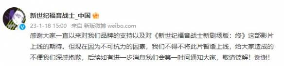 感谢大家一直以来对我们品牌的支持以及对《新世纪福音战士新剧场版:终》这部影片上线的期待。但现在因为不可抗力的因素,我们不得不将此片暂缓上线,给大家造成的不便我们深感抱歉,后续如有进一步消息我们会第一时间通知大家,敬请谅解!谢谢!