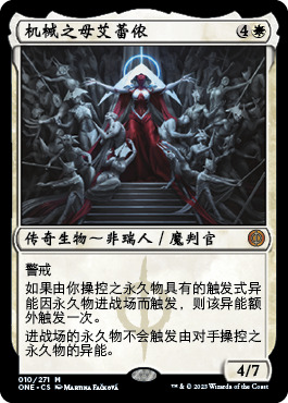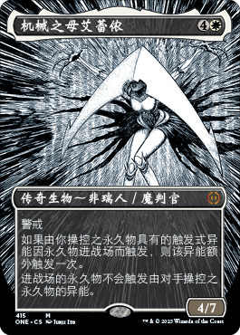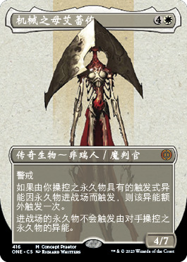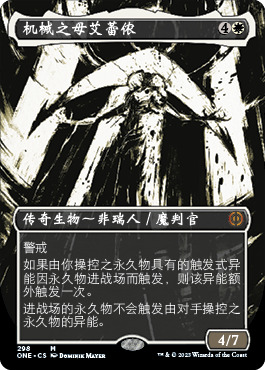 身为五大魔判官之一,秘稀牌机械之母艾蕾侬在这个位置会以以下特色牌框的形式出现:无边框脓水处理、无边框漫画处理(由伊藤润二绘制)以及非瑞文处理,每种牌张处理出现的几率均小于1%。