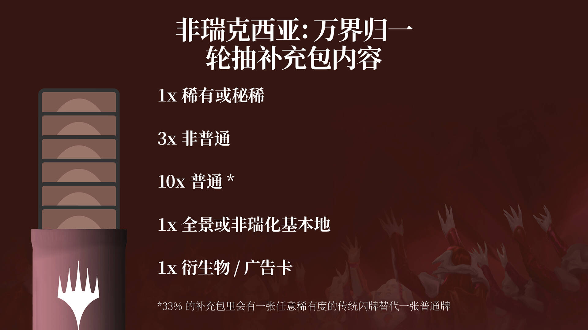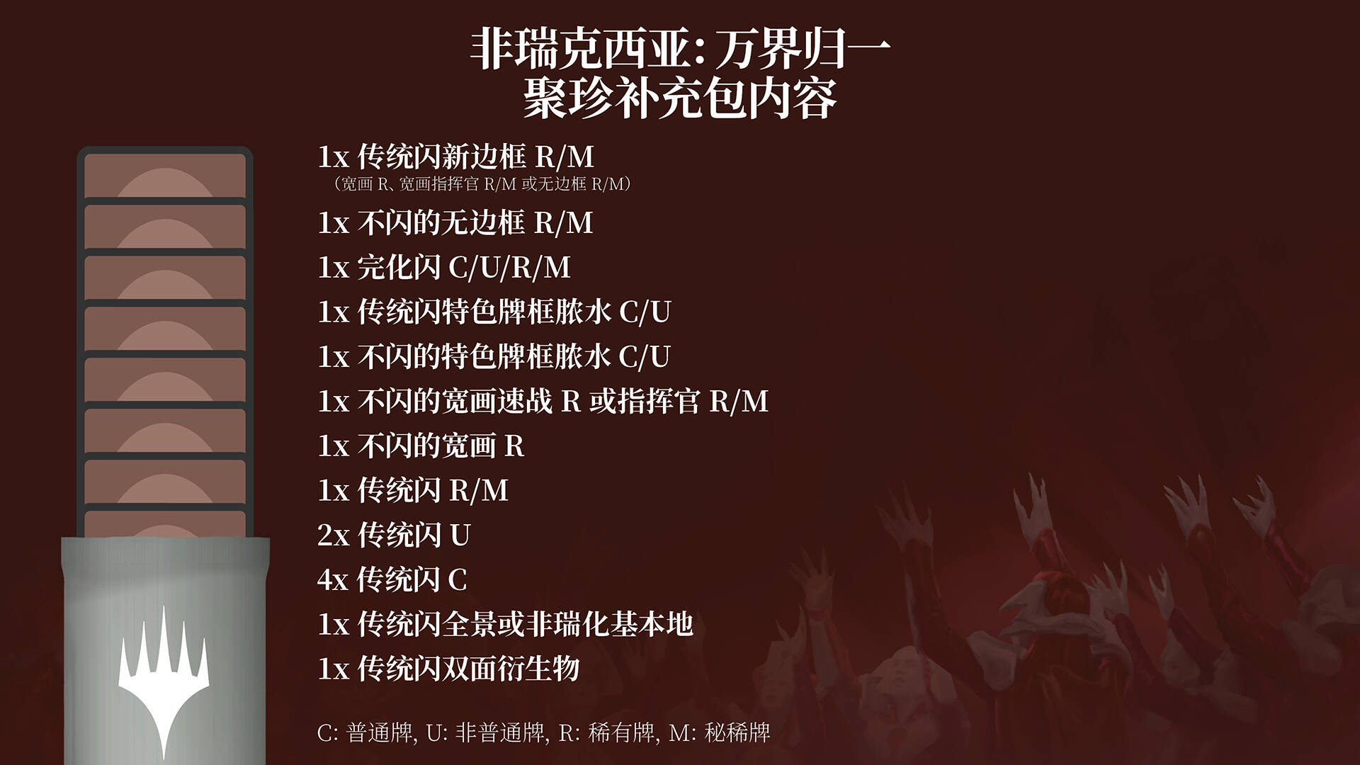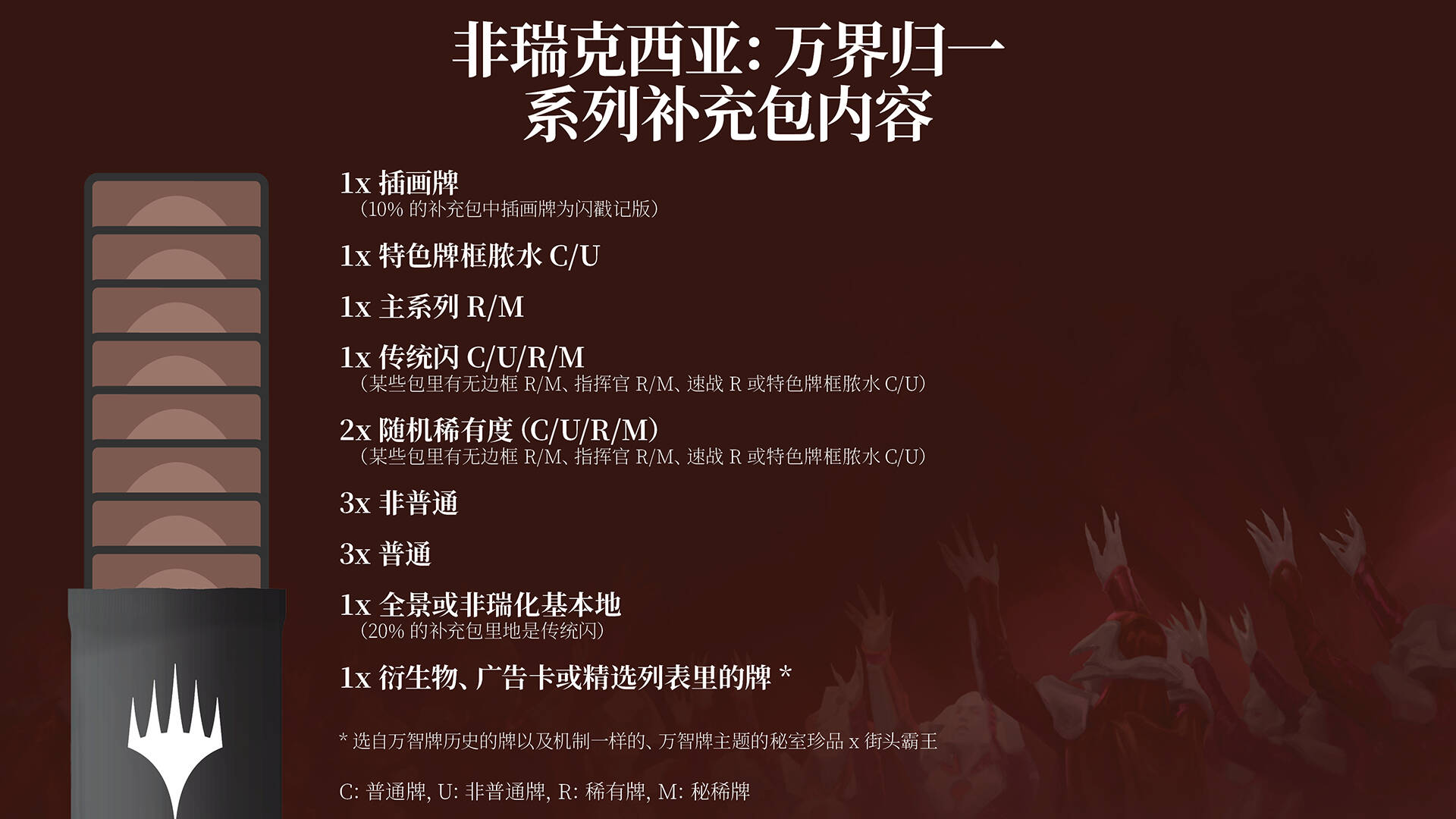 1张非瑞克西亚:万界归一指挥官套牌(ONC)中的宽画稀有或秘稀牌,或一张ONE速战补充包中的宽画牌——这一位置共有28种稀有牌(92%的补充包)和5种秘稀牌(8%的补充包)。具体选自以下产品:ONC的20种稀有和秘稀牌、ONE速战补充包的5种稀有牌以及系列补充包中8种新加入指挥官的稀有和秘稀牌。