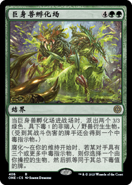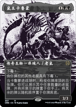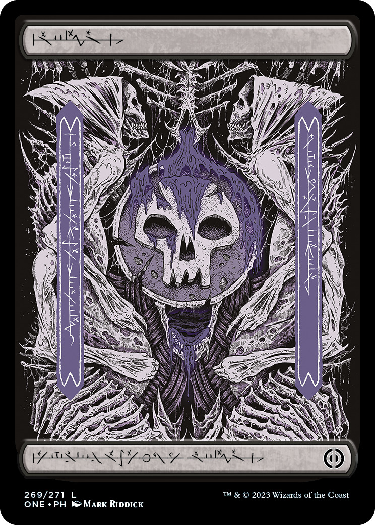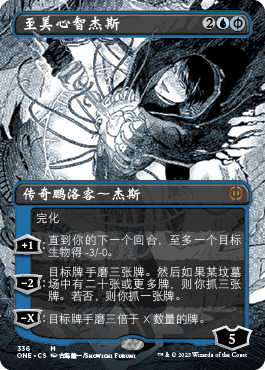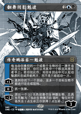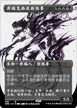 脓水和无边框脓水处理牌——ONE系列中补充包添趣的艺术总监Sarah Wassell和Tom Jenkot和一众艺术家合作,采用大胆的墨绘处理来突出非瑞人的核心特点。Adam Prosak和Grace Fong,他们分别是游戏设计团队和创意设计团队的领导,精选了系列中最有非瑞特色的牌张。共有6种普通牌和7种非普通牌具有带边框的脓水处理,16种稀有牌和11种秘稀牌具有无边框脓水处理。这些脓水处理牌除了会在系列、轮抽和聚珍补充包中出现,部分牌张还会出现在指挥官套牌附带的聚珍补充包尝鲜包中。