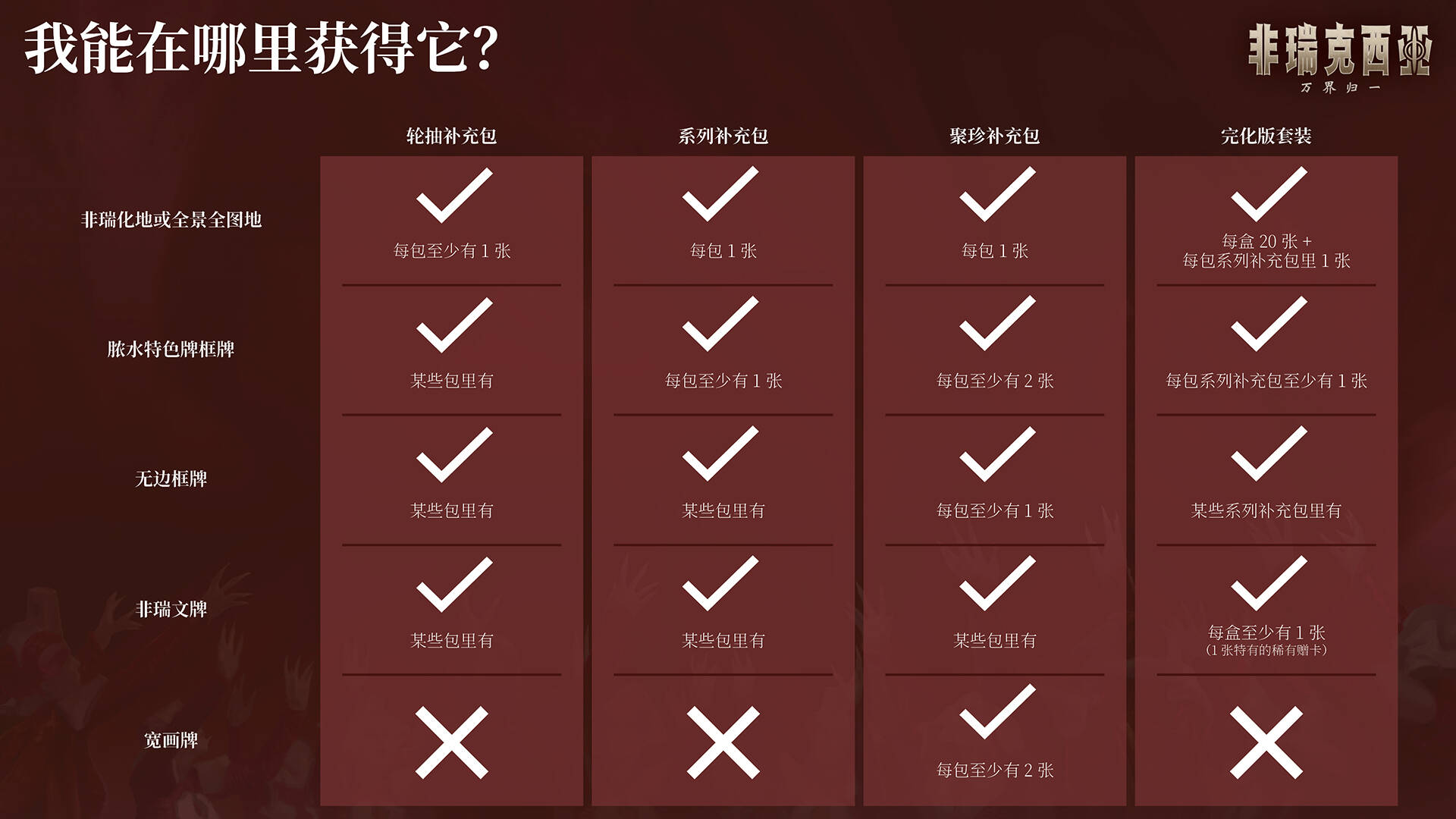 1张完化闪牌——每张完化闪牌上均有特殊质感闪处理的非瑞符号。共有6种普通牌(38%的补充包)、7种非普通牌(29%的补充包)、26种稀有牌(22%的补充包)和28种秘稀牌(11%的补充包)具有这一精美的全新牌张处理。