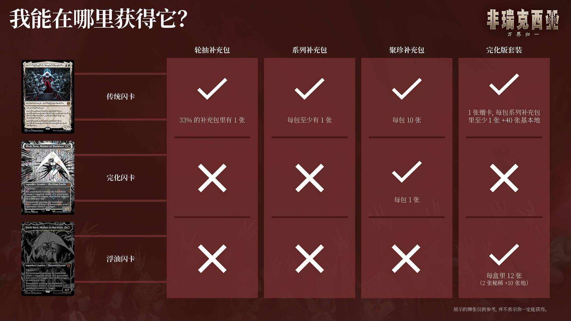 浮油闪——除了上述提及的精美处理之外,为发扬非瑞人的荣耀,我们推出了终极牌张处理。每个完化版套装内除了有趣的好物和一个流线型盒子之外,还有十二包非瑞克西亚:万界归一系列补充包和一包完化版补充包。