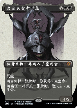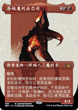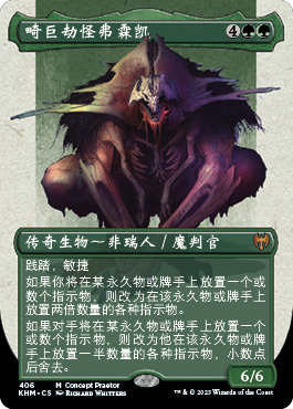 无边框概念魔判官——非瑞克西亚:万界归一旨在将整个非瑞克西亚的荣耀发扬光大,因此我们想确保五位魔判官都能在系列中出现。通过回顾他们最初的创作过程,我们精心打造了无边框概念魔判官,让Richard Whitters设计的魔判官概念插画再现风采。这些牌选自最近的系列。畸巨劫怪弗霖凯是代表凯德海姆魔判官的牌,只可在这张牌原本可用的赛制中使用它。