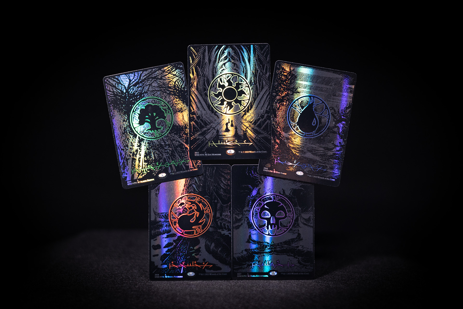 无边框双色地——可在系列、轮抽和聚珍补充包中开到,你可通过这些牌感受非瑞地带的超现实恐怖之美。身为秘罗地创痕的首席设计师,我非常高兴能看到绘有精美插画的五张“快地“回归标准系列。