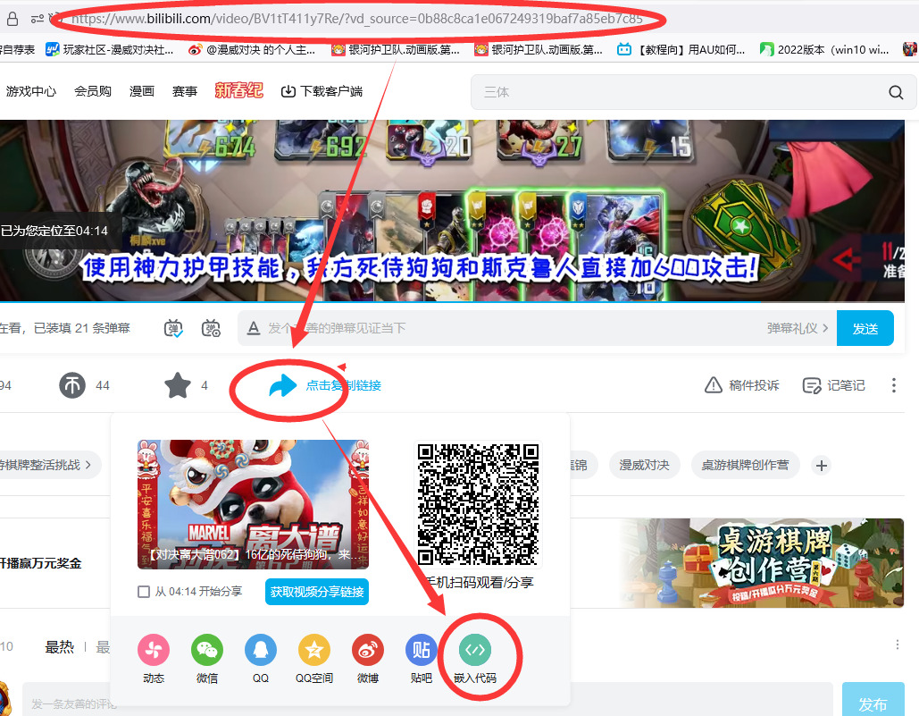 电脑网页打开需要分享的视频,点分享,再点嵌入代码: