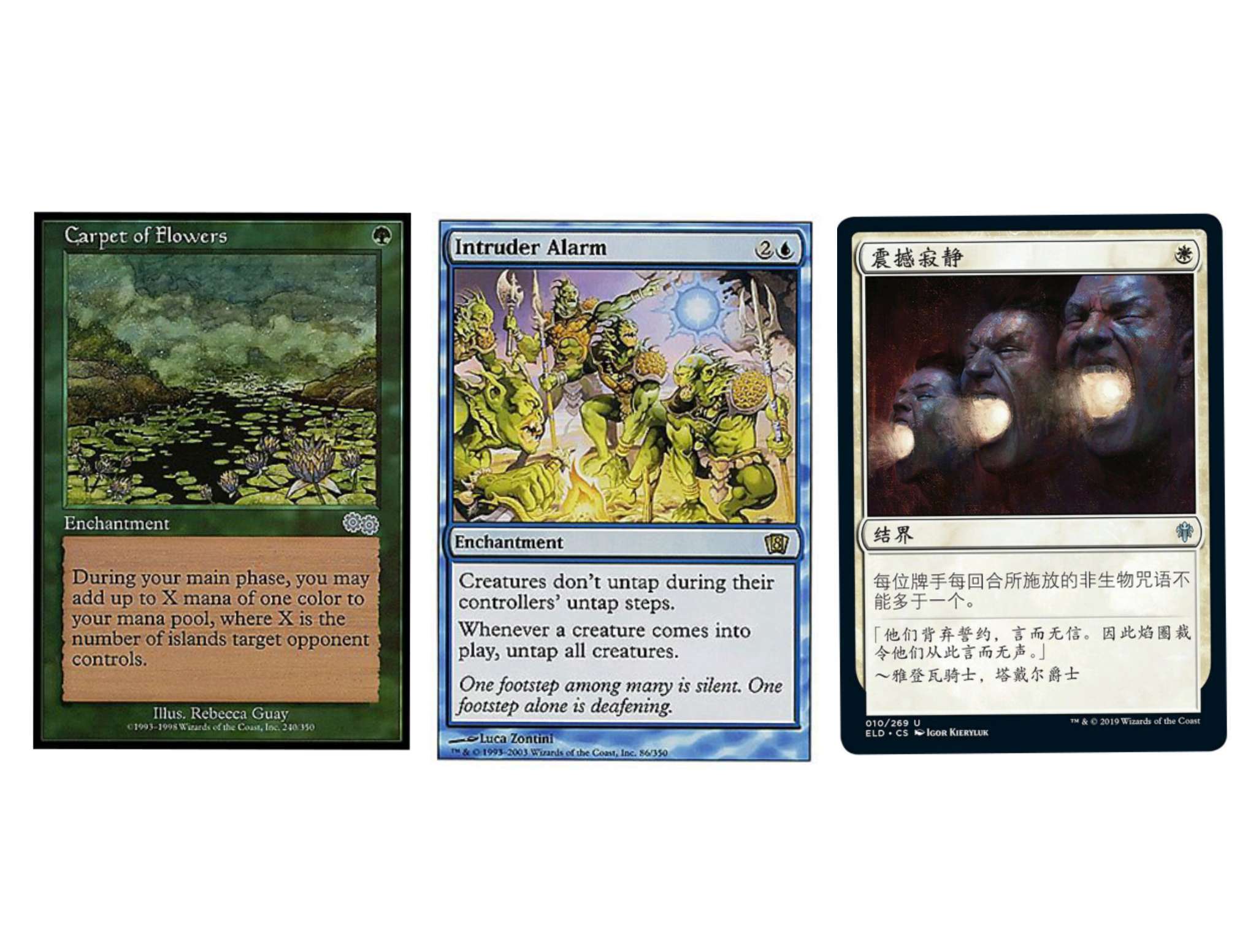 关于结界方面的选择:我推荐花之毯,入侵者警报,震撼寂静。入侵者警报主要是可以配合天华先人进行刷费的效果,而震撼寂静是达到锁的效果,而赋税压身也是很好的一张,同样根据各位当地的环境来抉择。因为我们的生物锁效果已经足够,不需要太多的结界锁来补充。