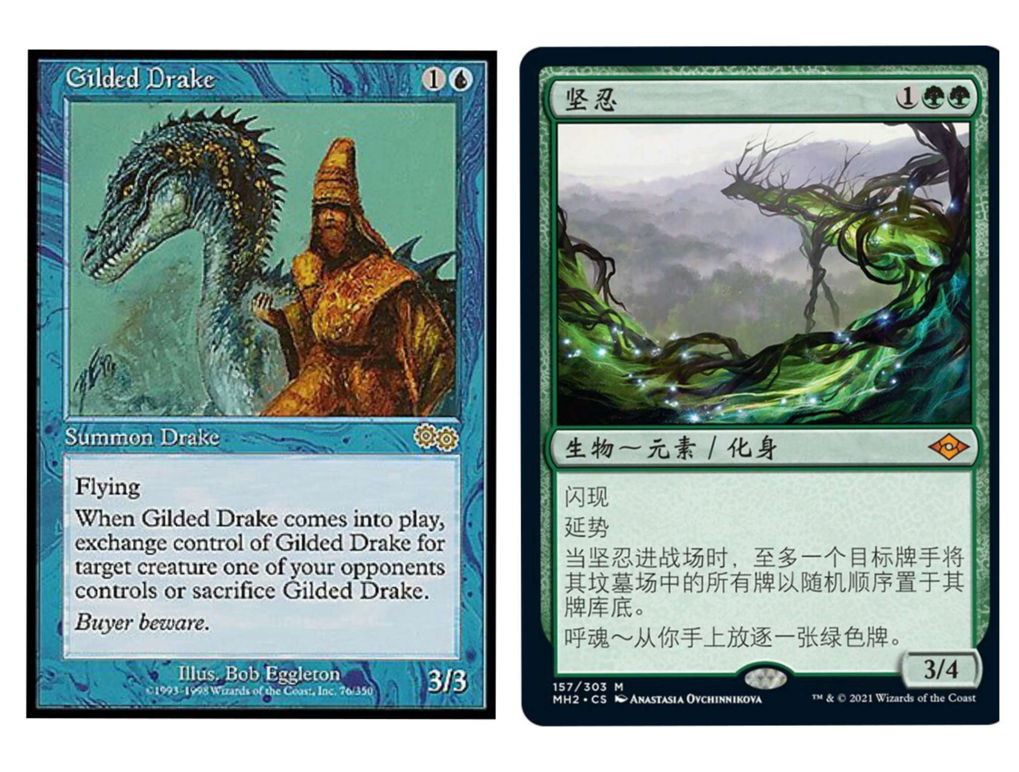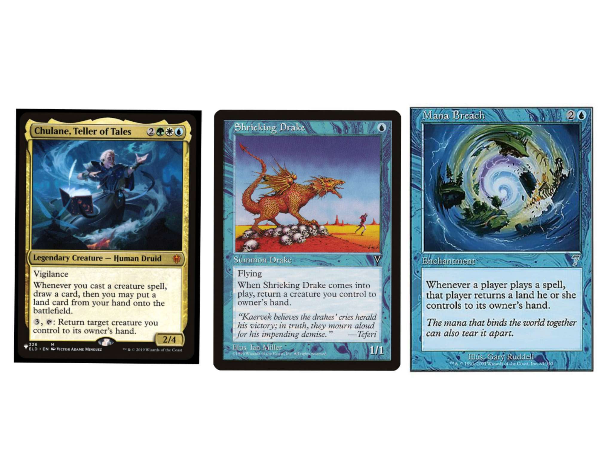 首先,从单卡强度来看楚兰就拥有了肉眼可见的过牌能力,每当我们放生物的时候,就可以摸上一张牌,然后下一张地,当然,我们也可以花上三费,把一些我们自己的低费用生物比如零费的飞机和蒙纳兽弹回手里,加上场上碎船惊惧兽的效果达成稳定的过牌。当然,在指挥官赛制里面,我们就不能这么玩了,他的获胜就需要靠组合技。