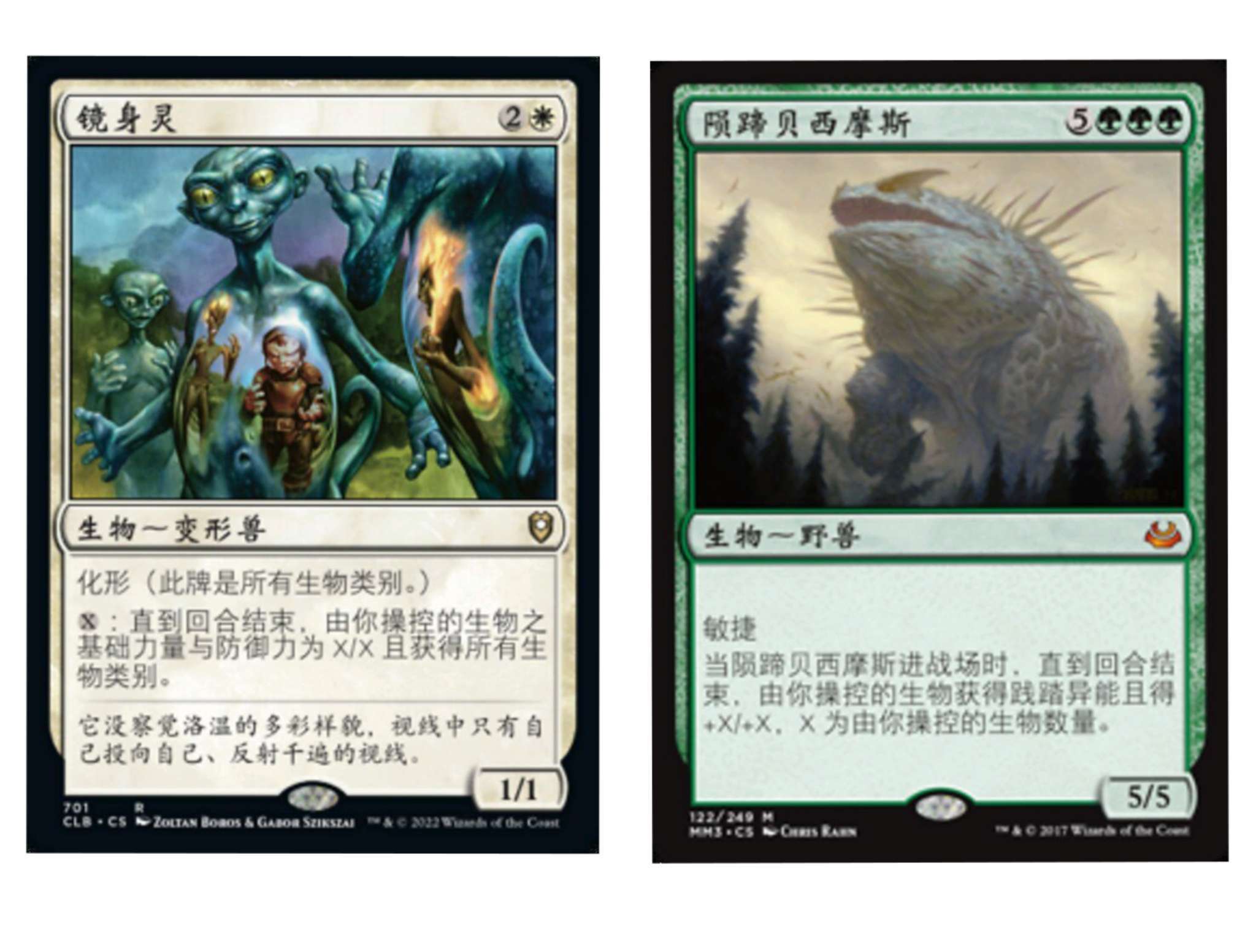 然后我们的出口就是依靠这张镜身灵和陨蹄贝西摩斯在充足的费用可供使用时,狠狠的给我们场上的生物刷身材,然后迅雷不及掩耳盗铃儿响叮当之势的带上践踏踹死对面。