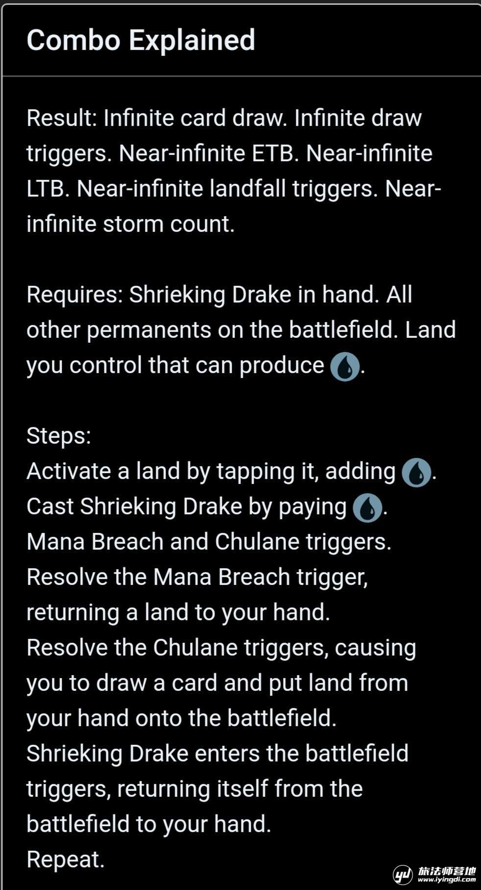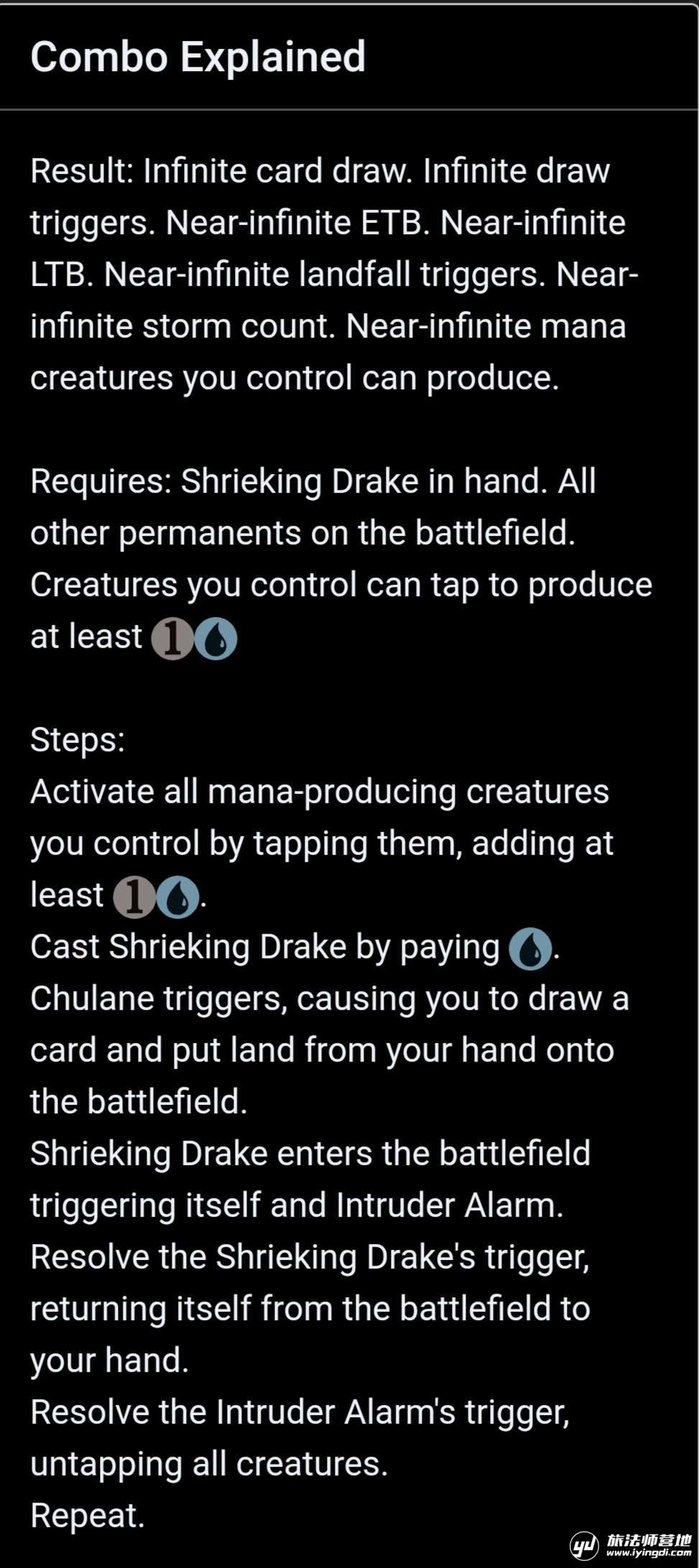 先说结果:Result: Infinite card draw. Infinite draw triggers. Near-infinite ETB. Near-infinite LTB. Near-infinite landfall triggers. Near-infinite storm count. Near-infinite mana creatures you control can produce。