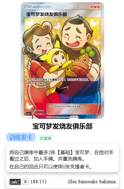 假设我们只通过抓牌来获取到恶食大王(粗略计算,不考虑第一回合必须抓到基础宝可梦以及卡奖等情况),那么概率是4/60≈0.06,是一个相当小的概率了,但是,如果我们在卡组中加入4张宝可梦发烧友俱乐部之后: