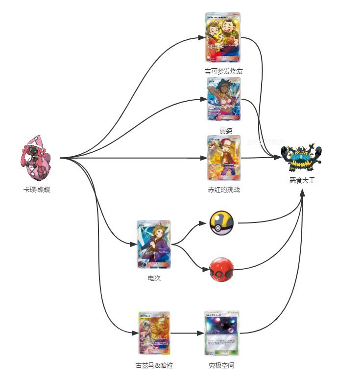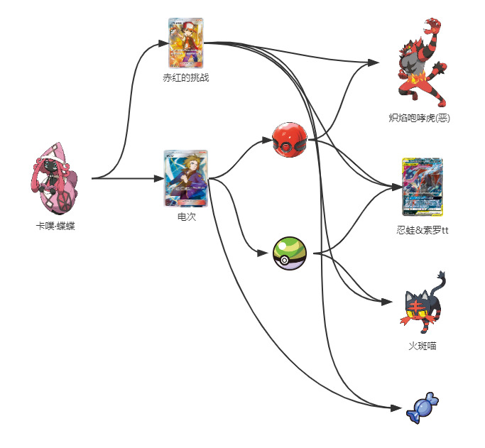 这套卡虽然不是t0,但是有击败皮捷,白喷的力量,而如果要打败这些快速启动的卡组,则需要忍蛙索罗tt扑上来,找糖把恶虎做出来,因此核心的卡便是忍蛙tt、底座、糖和恶虎,而红球可以找忍蛙索罗tt和恶虎GX,巢穴球可以找底座和忍蛙索罗tt,电次既可以找糖也可以找球以便拍下底座或GX,而此时蝶蝶就极有可能成为你启动的关键,所以一个复杂的连锁就构成了: