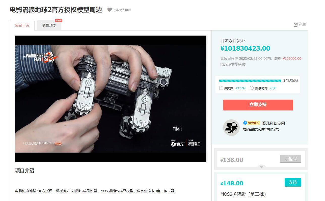 截止1月30日中午,电影《流浪地球2》官方授权模型周边的众筹金额达成了一个小目标,突破1亿元,并且还在快速增长。
