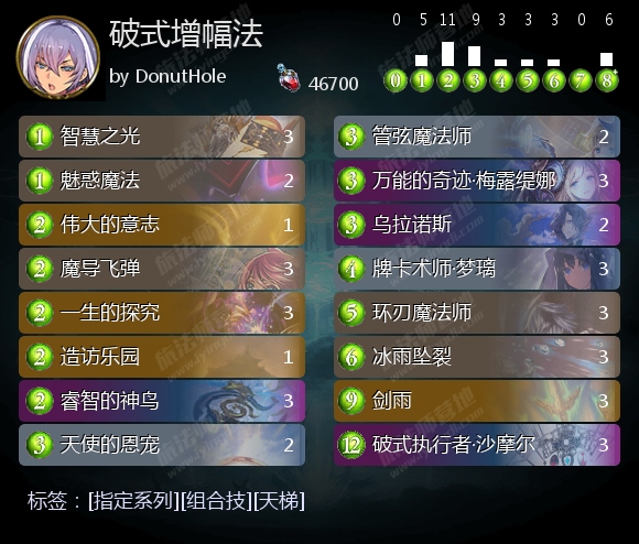 为了尽快实现一回合拍出多张被减至低费的伤害牌的游戏计划,增幅法需要在前中期尽快过牌、刷增幅。套牌中的大量抽牌法术,以及万能的奇迹·梅露缇娜、牌卡术师·梦璃等能兼顾抽牌、刷增幅的随从,都能很好地支持这一计划。还有些增幅法会投入五行宗师·久苑,以降低稳定性为代价,利用其增幅10效果高效刷增幅。