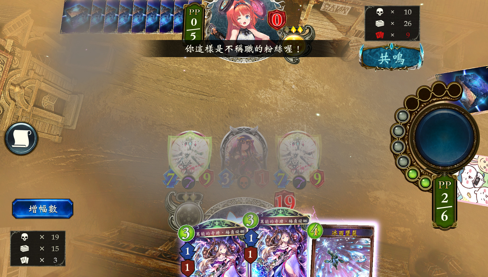 尽量将牌卡术师·梦璃、环刃留到减至低费后使用。