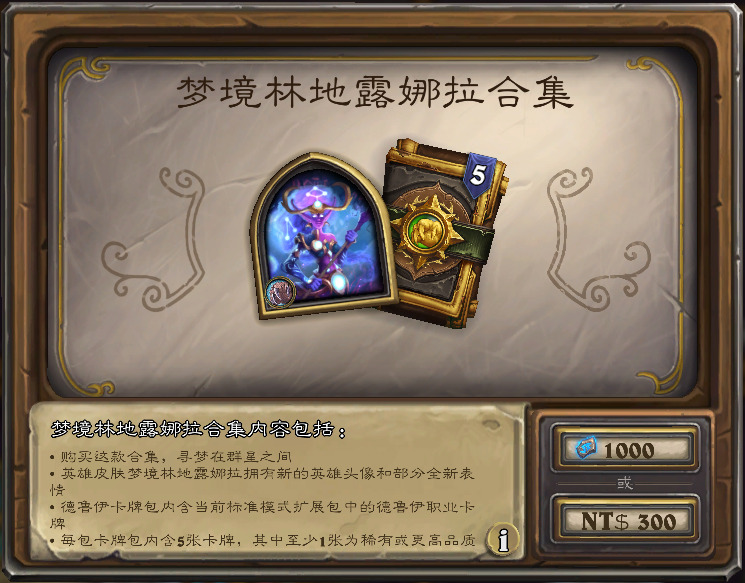 含构筑模式德鲁伊新皮肤“梦境林地露娜拉”和5德鲁伊包,售价1000符文石。