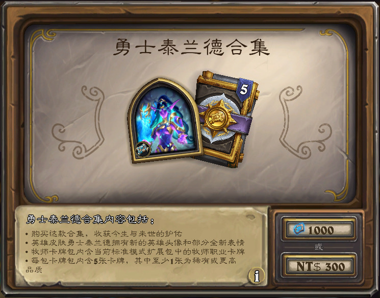 含构筑模式牧师新皮肤“勇士泰兰德”和5牧师包,售价1000符文石。